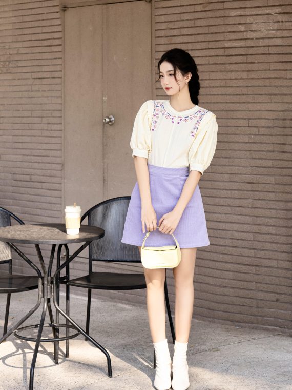 Áo kiểu tím xốp ODS thiết kế thêu hoa, cổ tròn, nhún dọc thân, tay phồng lỡ trẻ trung năng động – SIB24